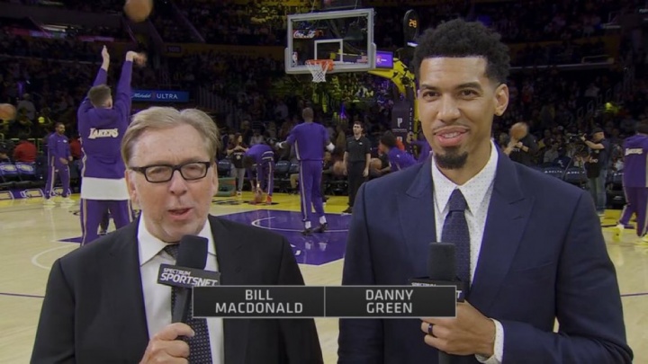 今日前NBA球員、現(xiàn)湖人電臺Spectrum SportsNet解說員丹尼-格林現(xiàn)場解說湖人VS勇士的季前賽。