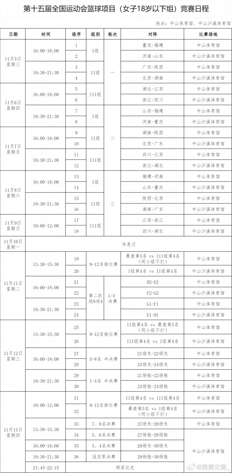 全運(yùn)會(huì)女籃完整賽程出爐,小組賽將在5天內(nèi)打完,隨后進(jìn)行淘汰賽以及排位賽階段的比賽,大部分球隊(duì)5天打3場小組賽還是較為寬松的,但由于中國香港參加全運(yùn)會(huì)女籃成年組的比賽,因此和她們同組的球隊(duì),需要在5天內(nèi)打完4場小組賽。具體賽程如圖: