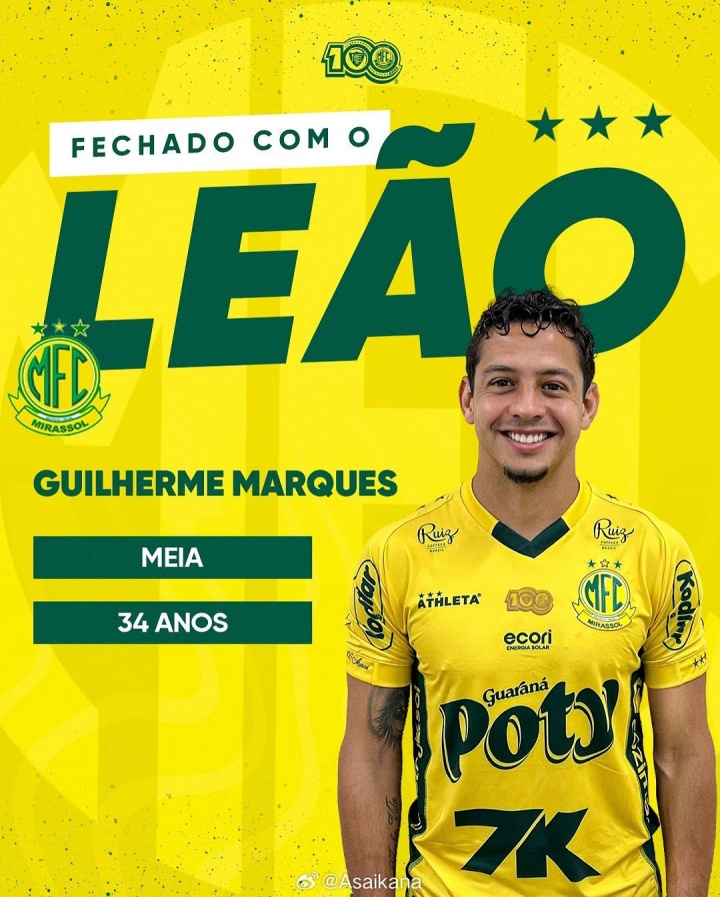 巴甲聯(lián)賽球隊(duì)米拉索爾(Mirassol-SP)官方宣布簽下了此前在長(zhǎng)春亞泰效力的巴西球員吉列爾梅(Guilherme Costa Marques)?,F(xiàn)年34歲的吉列爾梅曾兩次來(lái)華,分別效力于廣州城、長(zhǎng)春亞泰。2024賽季在亞泰效力期間遭遇十字韌帶重傷,因而淡出一線隊(duì)名單。他于今年4月傷愈復(fù)出,但未能繼續(xù)留在亞泰效力。夏轉(zhuǎn)期間最后時(shí)刻曾試圖加盟另一支中超球隊(duì),但最終未能成行。