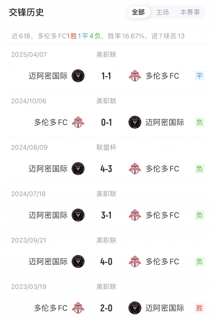 積分榜方面,邁阿密國際16勝7平6負積55分,近期收獲3連勝;多倫多FC5勝12平13負積27分,近8輪不勝且收獲6連平。邁阿密國際歷史對陣多輪多FC已5場不?。?勝1平)。