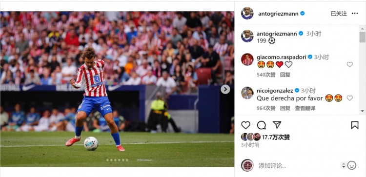 格列茲曼為馬競攻入199球,在西甲比賽中打進(jìn)199球,僅差1球達(dá)成200球里程碑,賽后他在社交媒體上曬出比賽照片,配文:“199??”