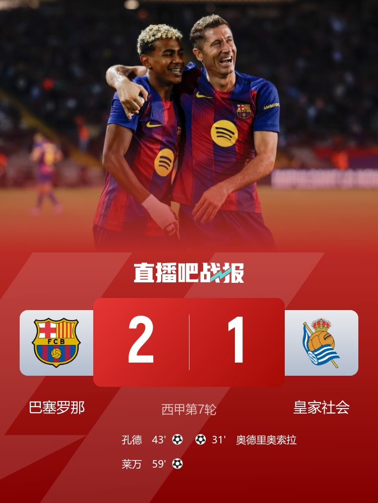 9月29日訊 北京時(shí)間9月29日凌晨0:30,2025-26賽季西甲聯(lián)賽第7輪,巴塞羅那在路易斯孔帕尼斯奧林匹克體育場(chǎng)迎戰(zhàn)皇家社會(huì)。上半場(chǎng)巴雷內(nèi)切亞助攻奧德里奧索拉進(jìn)球,孔德扳平,巴薩暫1-1皇家社會(huì);下半場(chǎng)亞馬爾助攻萊萬(wàn)破門,巴薩反超比分,亞馬爾進(jìn)球因越位在先無(wú)效,最終巴薩2-1逆轉(zhuǎn)皇家社會(huì),各項(xiàng)賽事5連勝,聯(lián)賽4聯(lián)賽,1分領(lǐng)跑積分榜。
