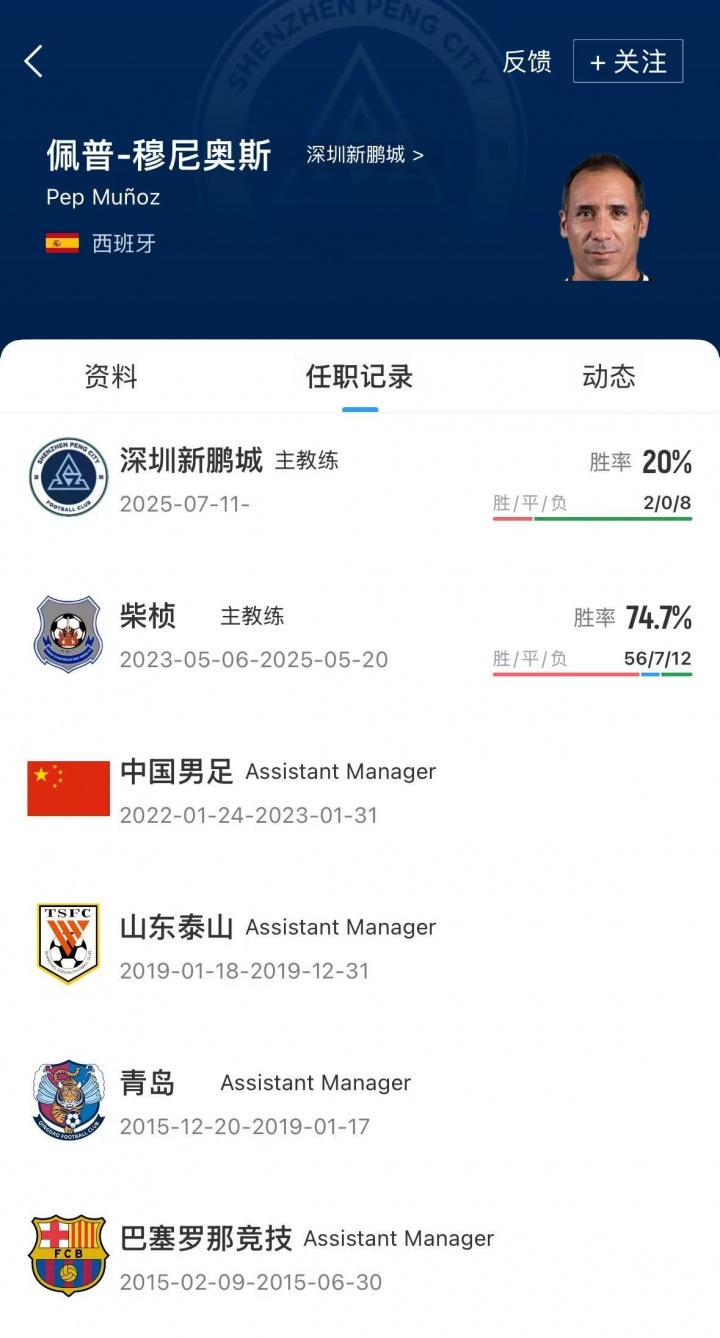 穆尼奧斯于今年7月接任深圳新鵬城主教練,接替前主帥拉坦齊奧。穆尼奧斯帶隊(duì)至今10場比賽2勝8負(fù),目前深圳新鵬城以20分排在積分榜倒數(shù)第4,僅高出降級區(qū)兩分。