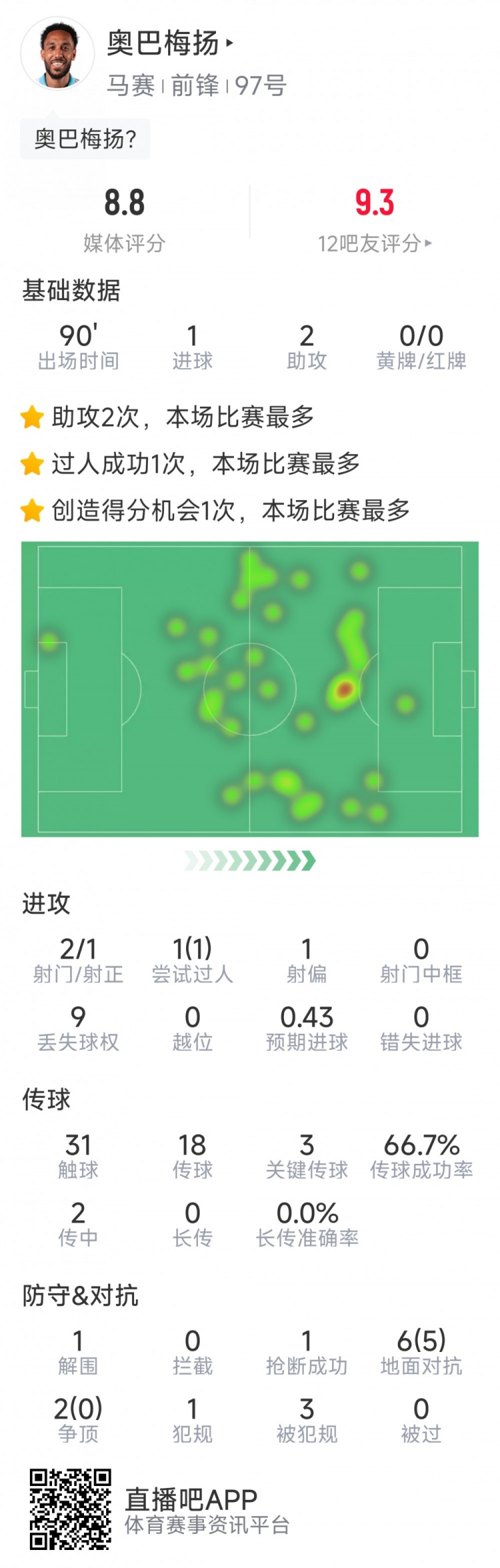 10月1日訊 在本輪歐冠,馬賽4-0大勝阿賈克斯。本場比賽奧巴梅揚1球2助攻,以下為他在本場數(shù)據(jù):