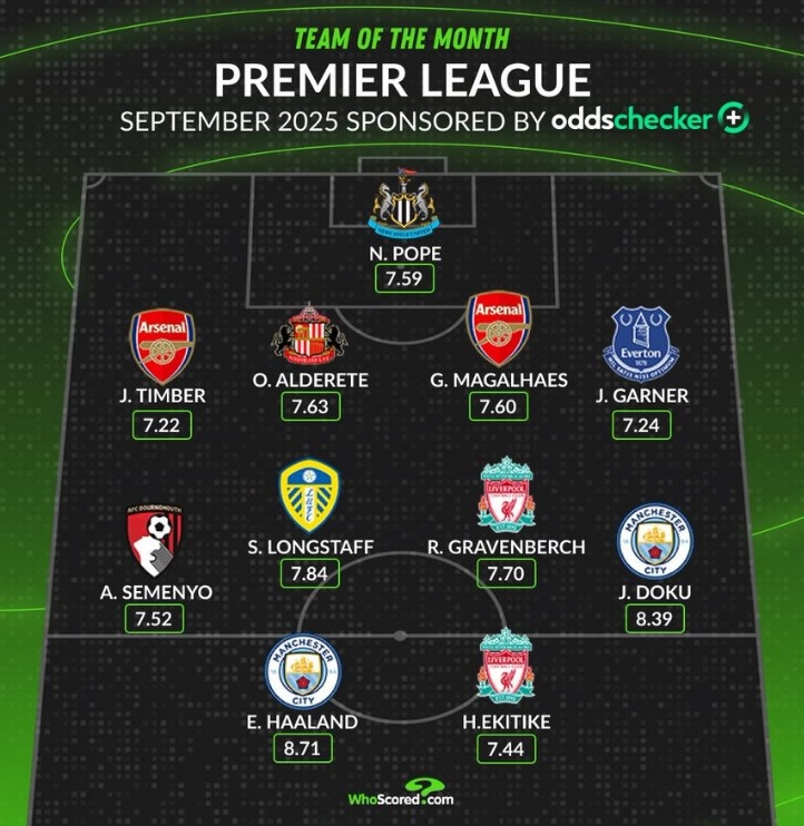 10月1日訊 數(shù)據(jù)網(wǎng)站W(wǎng)hoscored盤點了英超9月場均評分最高陣容,具體如下: