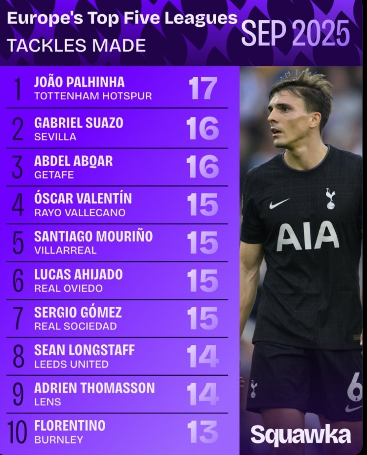 10月1日訊 今天,數(shù)據(jù)機(jī)構(gòu)Squawka在社媒公布了九月份鏟球榜,熱刺中場(chǎng)帕利尼亞以17次成功鏟球位居榜首。