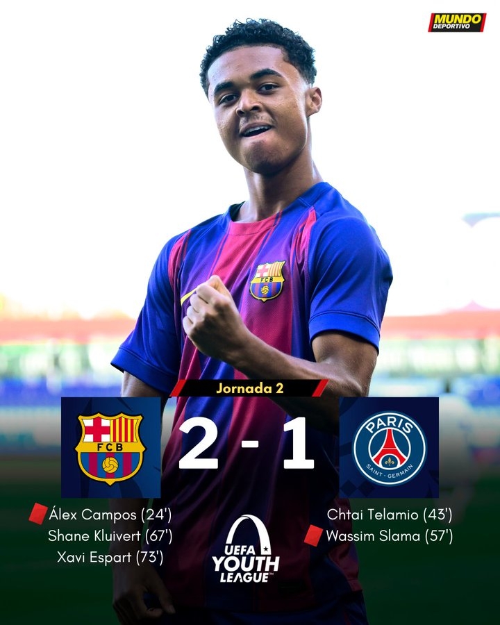 青年歐冠巴薩2-1逆轉巴黎,克魯伊維特小兒子兜射死角破門