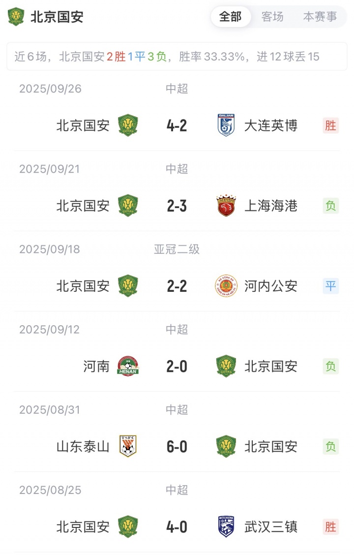 國安與麥克阿瑟此前還未交手過,雙方近6場比賽戰(zhàn)績?nèi)缦拢?/p>