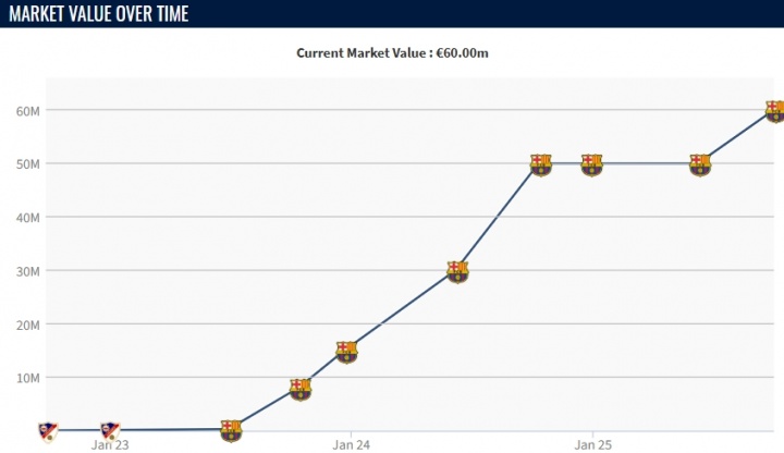 費爾明目前已經(jīng)代表巴薩一線隊出場93次,貢獻(xiàn)21球11助,球員德轉(zhuǎn)身價也由兩年前的800萬歐元上漲至如今的6000萬歐元