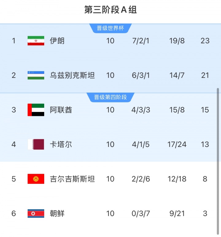 世界杯預(yù)選賽第三階段,烏茲別克斯坦排名A組第二名,晉級(jí)2026年世界杯。