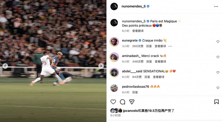 10月2日訊 歐冠聯(lián)賽階段第2輪巴黎2-1擊敗巴薩,賽后巴黎后衛(wèi)努諾-門德斯發(fā)文慶祝勝利。