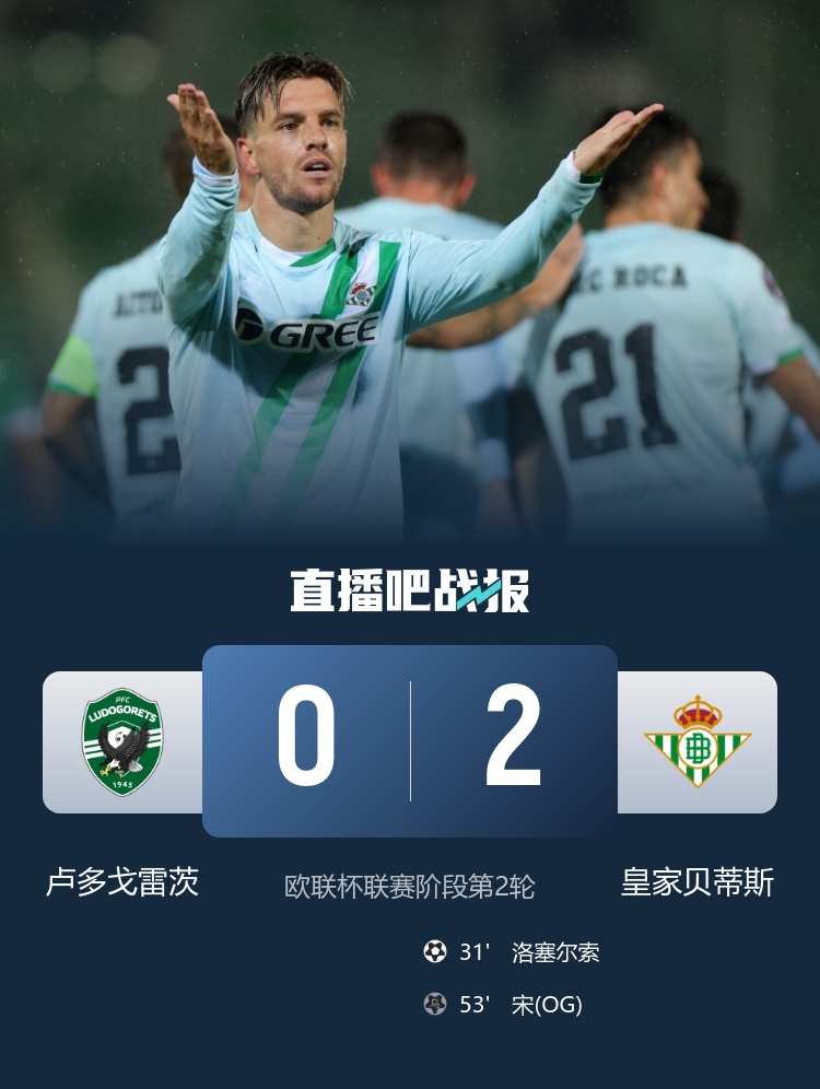 10月3日訊 北京時間0:45,歐聯(lián)杯聯(lián)賽階段第2輪盧多戈雷茨vs皇家貝蒂斯。上半場,洛塞爾索遠射幫助貝蒂斯取得領(lǐng)先!下半場,菲爾波造烏龍!最終,貝蒂斯2-0擊敗盧多戈雷茨,取得新賽季歐聯(lián)首勝!
