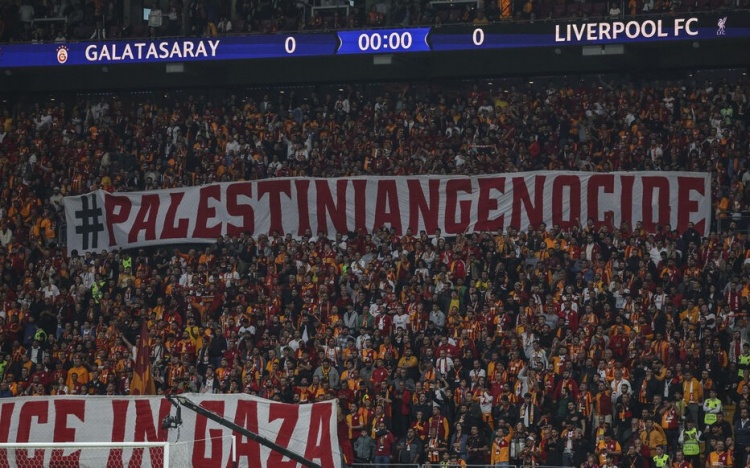 10月3日訊 《巴黎人報》報道,在加拉塔薩雷1-0戰(zhàn)勝利物浦的歐冠比賽中,加拉塔薩雷球迷拉出許多橫幅,聲援巴勒斯坦民眾。