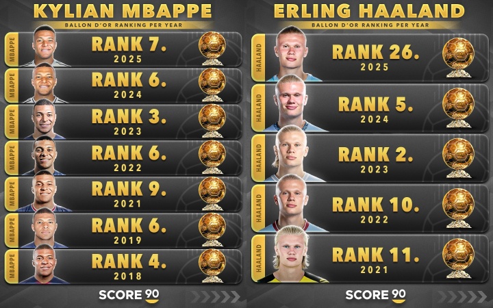 10月03日訊 外媒Score90制作了一組對比圖,羅列了姆巴佩和哈蘭德的歷年金球獎排名。