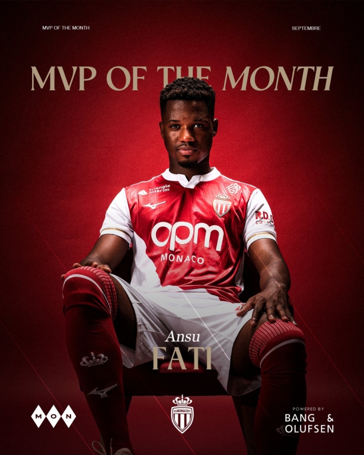 法蒂9月份為摩納哥出戰(zhàn)3場比賽,打進4球。摩納哥官方社媒曬出海報,宣布經(jīng)過球迷的投票,法蒂當選9月份摩納哥隊內最佳球員。