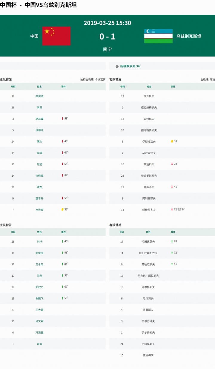 2019年3月25日,第三屆中國(guó)杯季軍爭(zhēng)奪戰(zhàn)在中國(guó)隊(duì)和烏茲別克斯坦之間進(jìn)行。上半場(chǎng)國(guó)足進(jìn)攻端毫無(wú)亮點(diǎn),紹穆羅多夫爆射破門(mén),韋世豪兇狠飛鏟染黃,下半場(chǎng)對(duì)方錯(cuò)失多次良機(jī)。最終國(guó)足0-1不敵烏茲別克斯坦,當(dāng)屆中國(guó)杯兩連敗且一球未進(jìn),排名墊底。