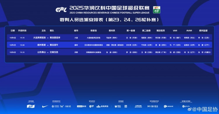 另外兩場比賽,大連英博vs青島西海岸的主裁是馬運坤,而山東泰山vs云南玉昆的主裁則是張超,兩場的VAR視頻裁判分別為劉釗和劉威。