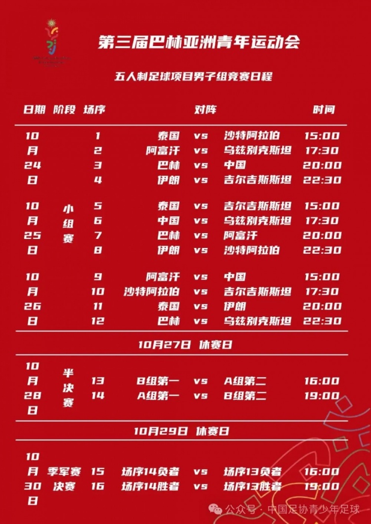 10月4日訊 10月22日-10月31日,第三屆亞洲青年運動會(以下簡稱“巴林亞青會”)將在巴林舉行,本屆比賽首次將五人制足球納入正式比賽項目,中國隊分別派出男、女隊參賽。近日,巴林亞青會組委會公布五人制足球項目競賽日程。