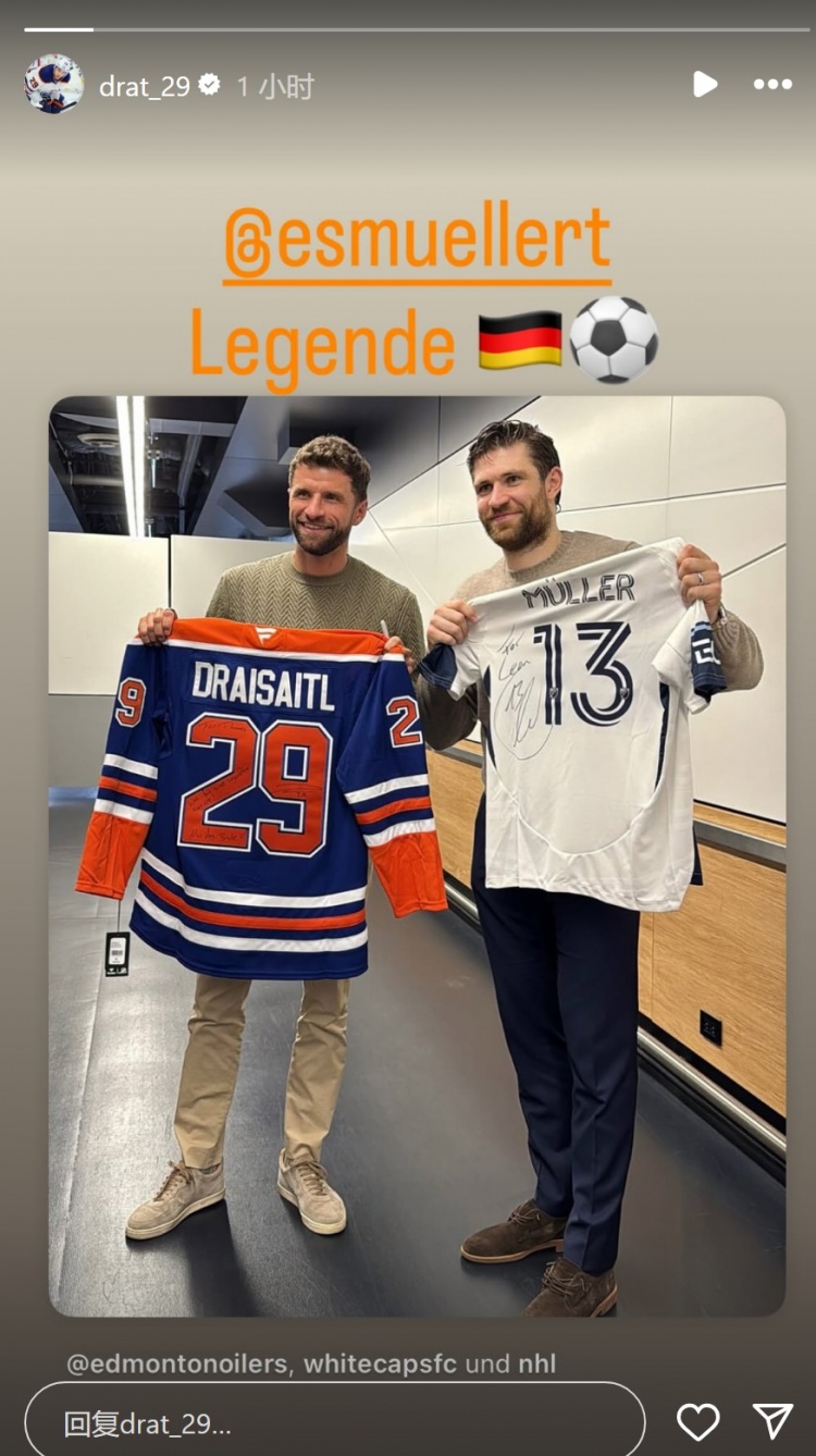 穆勒與德國冰球選手德賴塞特爾交換球衣并合影,后者效力于NHL埃德蒙頓油人隊,也是司職前鋒,兩人社媒轉(zhuǎn)發(fā)合照,并互稱對方為傳奇。