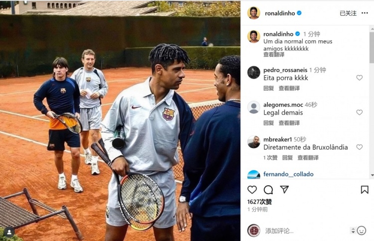 羅納爾迪尼奧社媒曬出效力巴薩時期與里杰卡爾德、梅西、羅卡(助教)一起打網(wǎng)球的照片,配文:“與朋友們度過的平常一天,哈哈哈。”
