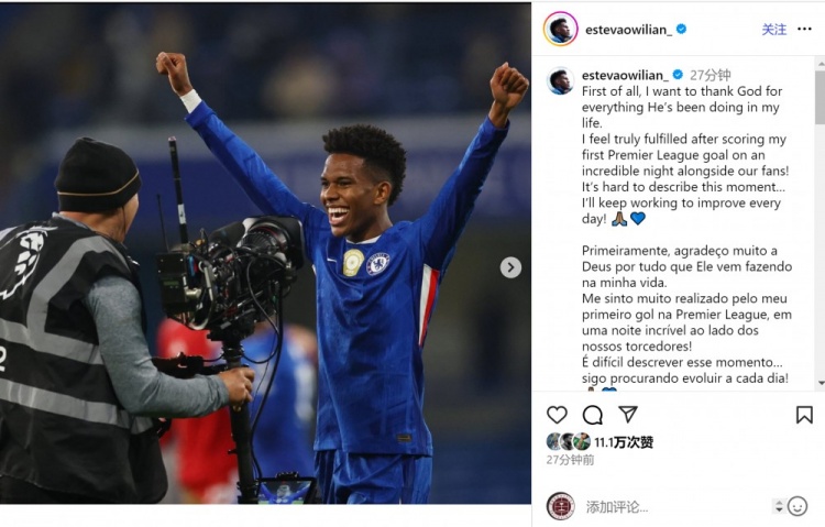 埃斯特旺社媒曬出慶祝的照片,配文:“首先,我要感謝上帝在我生命中所做的一切。在與球迷共度的非凡之夜攻入個人英超首球之后,我感到無比滿足!