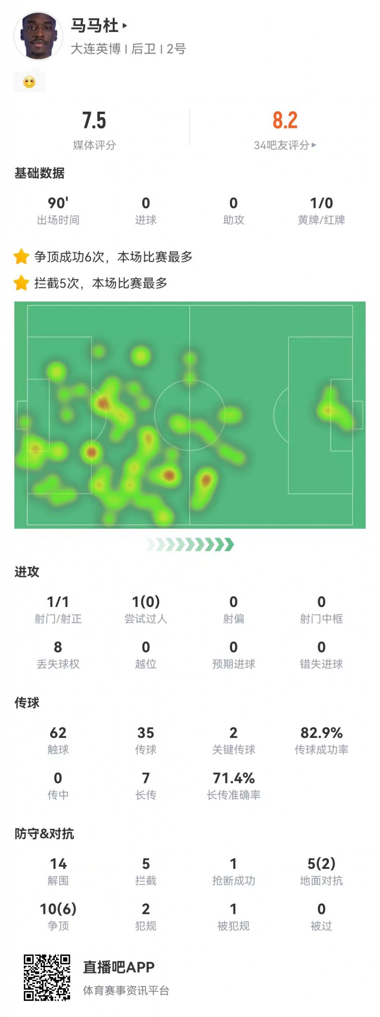 在大連英博0-2青島西海岸的比賽中,馬馬杜評分7.5分,打滿全場,吃到一張黃牌。