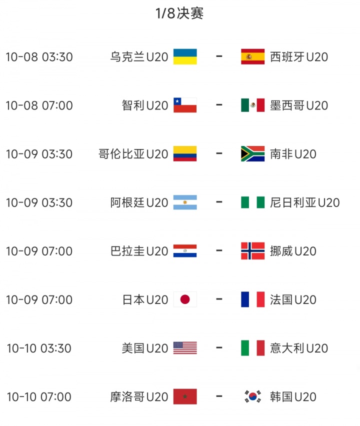 10月06日訊 世青賽(U20世界杯)16強全部出爐,對陣情況也隨之全部揭曉。16強比賽將從10月8日開始進行。