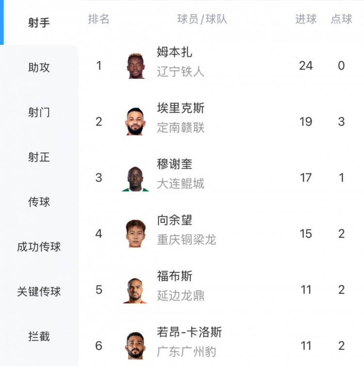 10月6日訊 中甲聯(lián)賽25輪戰(zhàn)罷,射手榜方面,本輪雙響的姆本扎24球領(lǐng)跑,本輪分別進(jìn)球的埃里克斯和向余望分居第二和第四位。