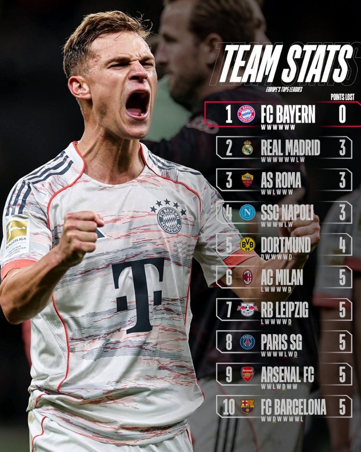 五大聯(lián)賽最少失分榜:拜仁全勝居首,皇馬、羅馬、那不勒斯失3分