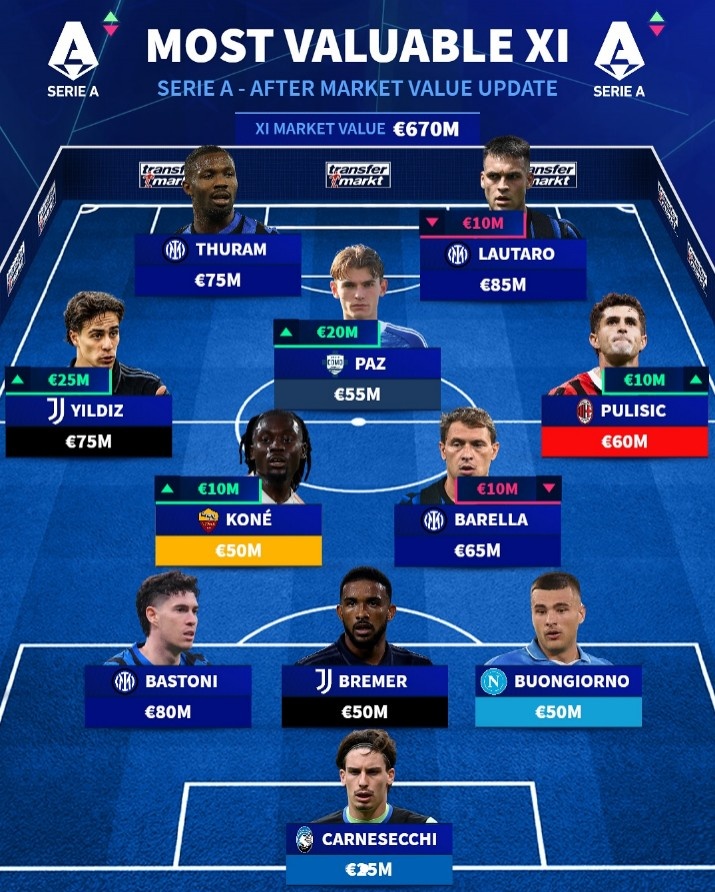意甲最貴首發(fā):伊爾迪茲普利西奇帕斯在列,國米四人入選