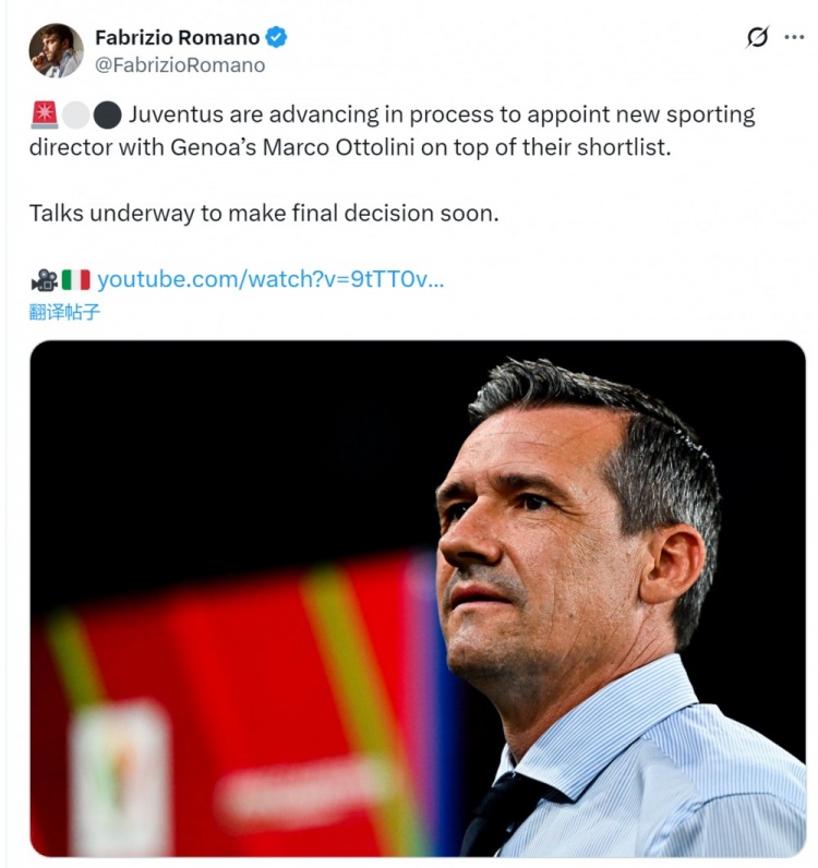 羅馬諾透露,尤文正在積極推進(jìn)體育總監(jiān)的任命工作,熱那亞體育總監(jiān)奧托里尼是這一職位的頭號(hào)候選。相關(guān)談判正在進(jìn)行之中,以盡快做出最終決定。