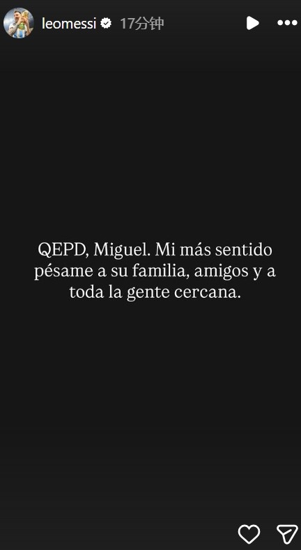 在社交媒體上,阿根廷巨星梅西表達(dá)了哀悼之情,他寫(xiě)道:安息吧,米格爾!我要向他的家人、朋友以及所有親近的人致以最深切的哀悼!