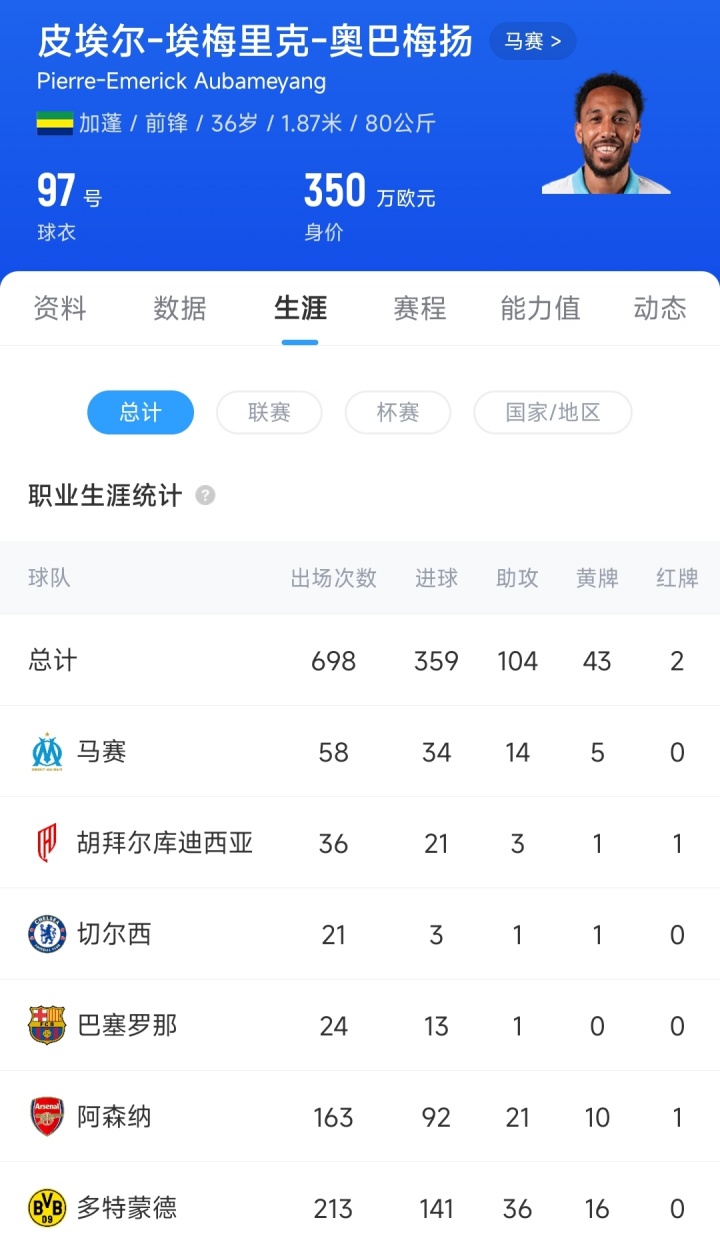 今年夏窗自由身回歸馬賽后,奧巴梅揚(yáng)本賽季俱樂部7場比賽已經(jīng)貢獻(xiàn)了4粒進(jìn)球和2次助攻,本場比賽又為加蓬國家隊打入4球,他新賽季各項賽事已經(jīng)貢獻(xiàn)8球2助。