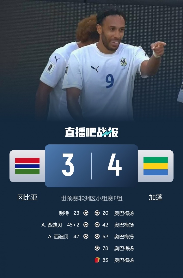 10月10日訊 世預(yù)賽非洲區(qū)F組第9輪比賽,加蓬客場4-3戰(zhàn)勝岡比亞,36歲的加蓬前鋒奧巴梅揚(yáng)上演大四喜,一己之力為加蓬拿下了這場勝利!