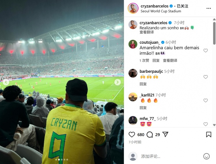 身穿自己名字的巴西9號球衣!克雷?,F(xiàn)場觀戰(zhàn)巴西vs韓國