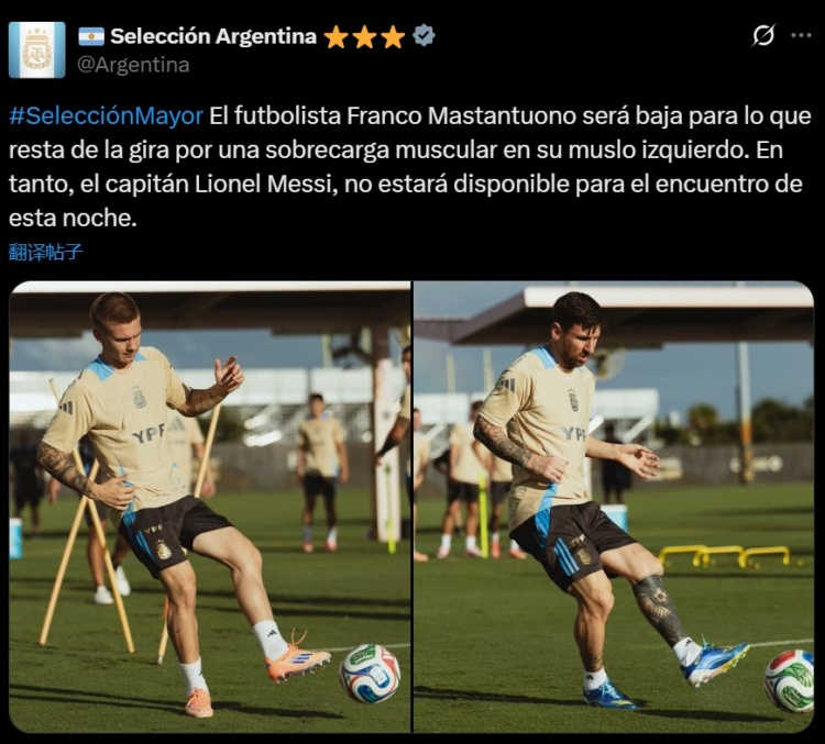 阿根廷官方寫道:“球員馬斯坦托諾的左大腿肌肉過度疲勞,將缺席接下來的巡回比賽。與此同時,隊長梅西也將缺席今晚的比賽?!?/p>