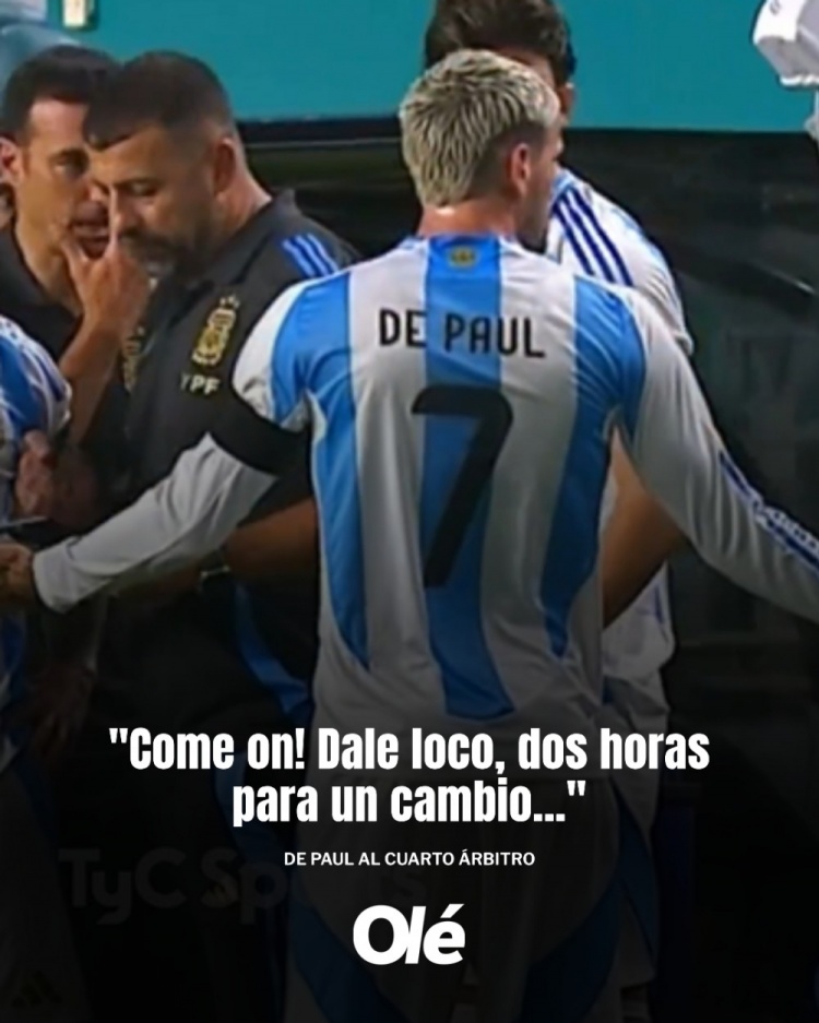 德保羅此役為阿根廷隊替補出場,據《奧萊報》報道,德保羅對第四官員抱怨換人太慢,他說道:“快點!哥們,換個人要等倆小時?!?/p>
