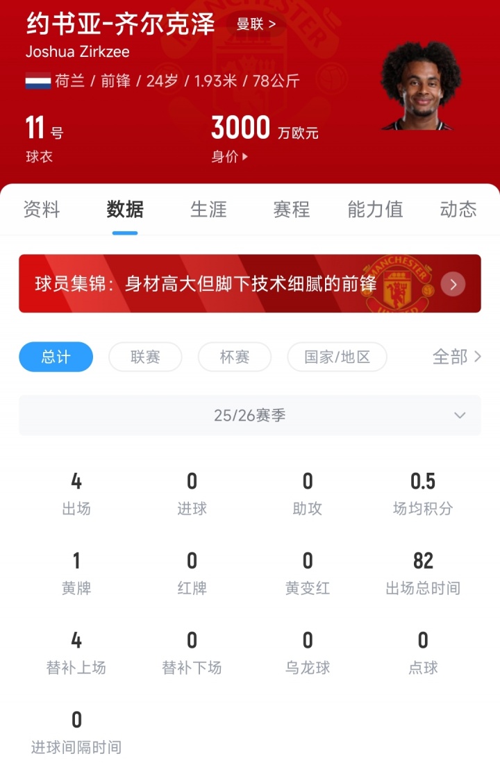 2024年夏窗,時任曼聯(lián)主帥滕哈赫花費4250萬歐元,從博洛尼亞簽下了自己的荷蘭老鄉(xiāng)齊爾克澤。加盟曼聯(lián)至今,齊爾克澤共代表球隊出戰(zhàn)53場比賽,貢獻7粒進球和3次助攻,目前24歲的齊爾克澤德轉身價為3000萬歐元。