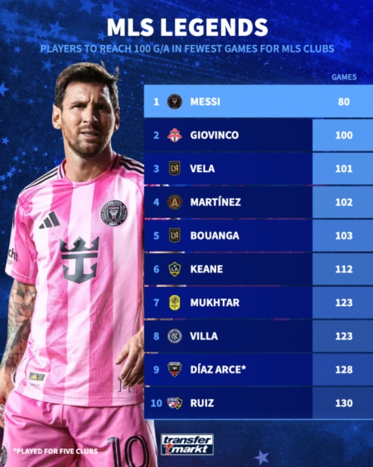 美職聯(lián)球員參與百球場次排行:梅西80場最快,第二喬文科100場