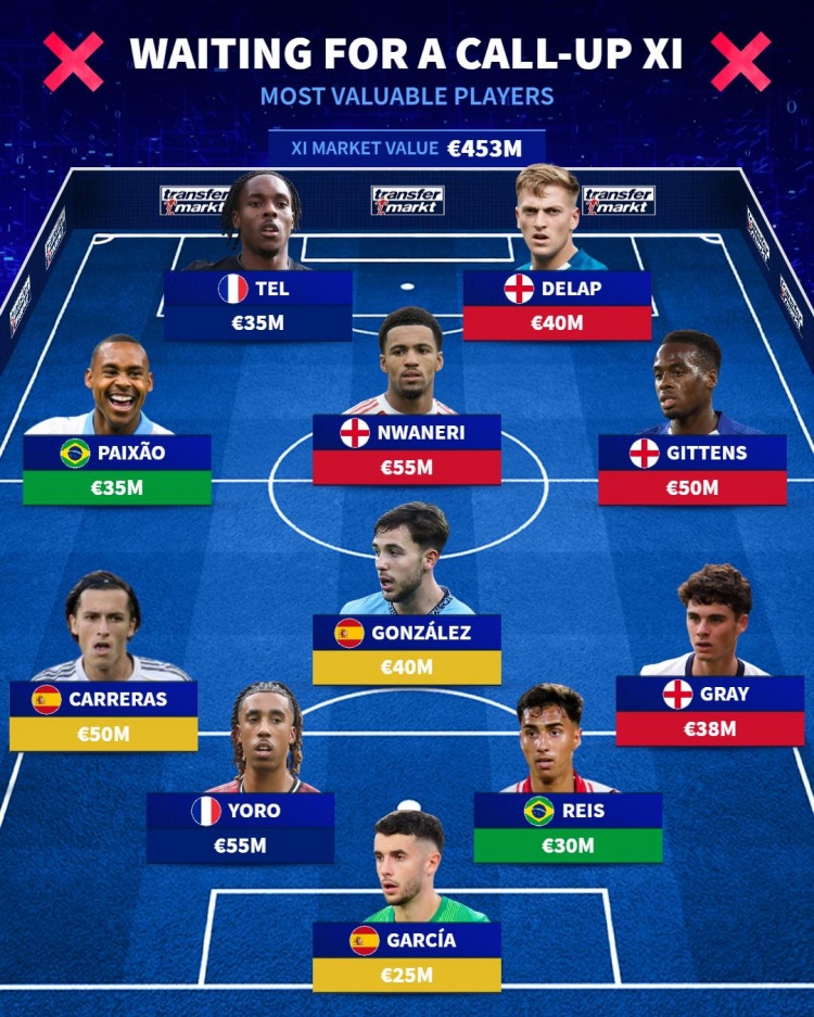 無緣國家隊身價最高陣容(總價4.53億歐,指從未入選國家隊)