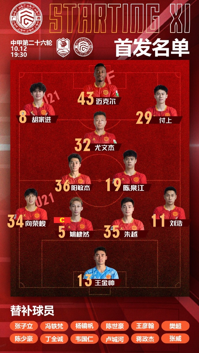 2025華潤(rùn)飲料中甲聯(lián)賽第26輪,廣西平果國晶客戰(zhàn)青島紅獅首發(fā)名單