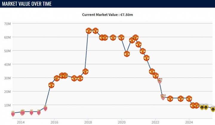 在2015年,19歲的馬夏爾曾以6000萬歐元轉會費加盟曼聯(lián),并在當年獲得歐洲金童獎。在2018年,馬夏爾的德轉身價達到生涯巔峰,高達6500萬歐元。這位法國前鋒在曼聯(lián)總計代表球隊出場317次,貢獻90球54助。隨后在去年夏天離開老特拉福德,但在雅典AEK,球員也沒有找回狀態(tài)。