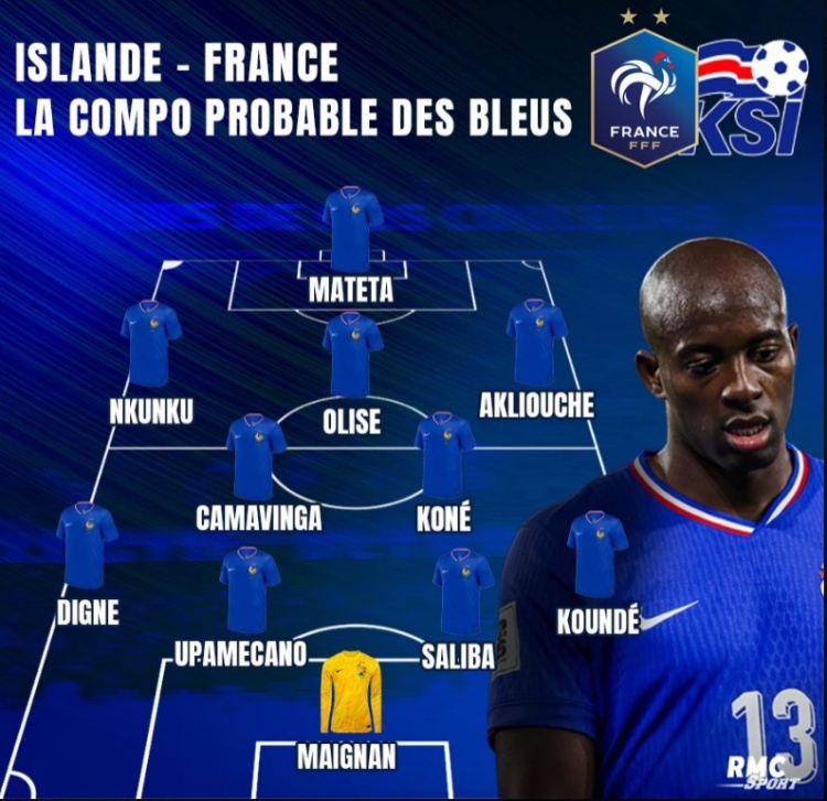 10月13日訊 北京時間周二凌晨的世預(yù)賽歐洲區(qū)小組賽,法國將前往客場挑戰(zhàn)冰島。RMC對本場比賽的首發(fā)陣容進(jìn)行預(yù)測,馬特塔首發(fā),于帕梅卡諾和薩利巴搭檔中衛(wèi)。