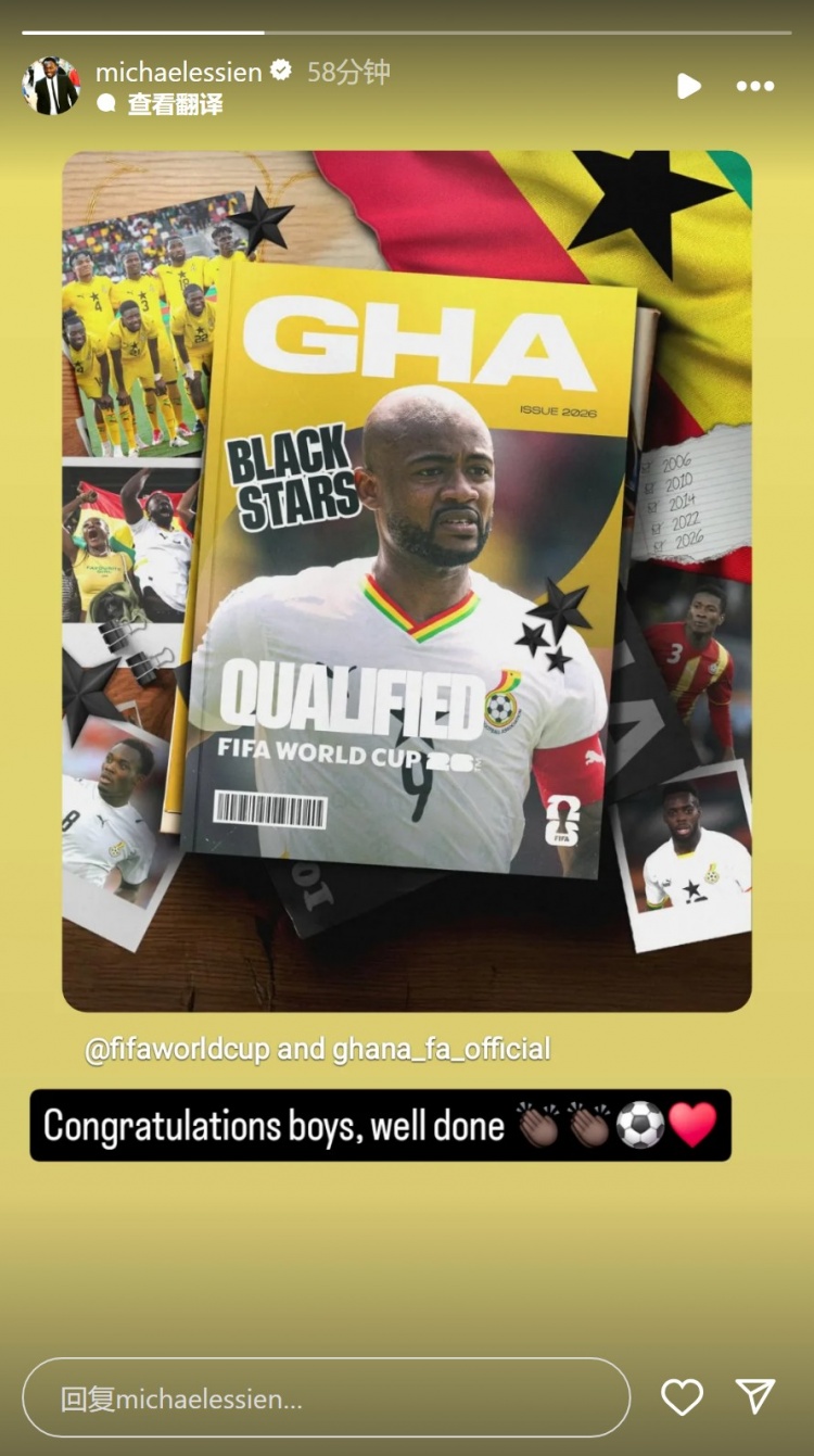 加納足壇名宿埃辛社媒轉(zhuǎn)發(fā)海報,祝賀加納進(jìn)軍世界杯,配文:“恭喜小伙子們,干得好!”