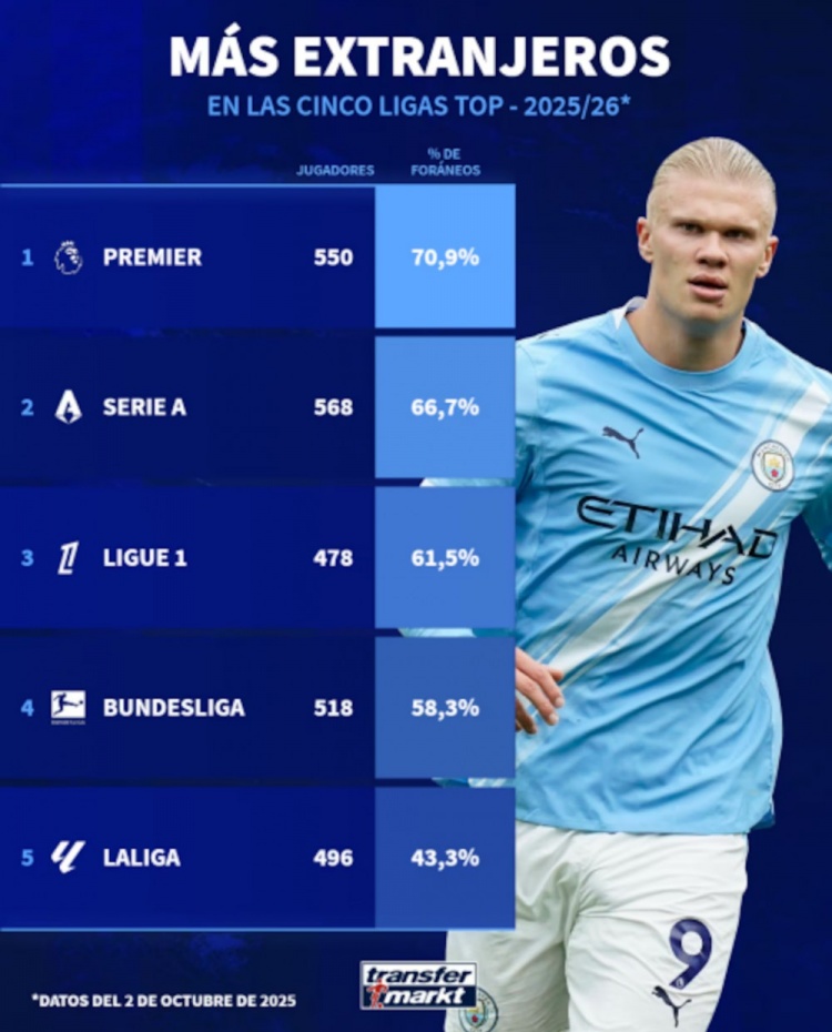 10月14日訊 根據(jù)德國轉(zhuǎn)會(huì)市場的數(shù)據(jù),本賽季五大聯(lián)賽英超外籍球員占比最高,西甲外籍球員占比最低。