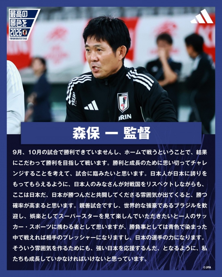 “雖然只是一場國際友誼賽,但對手巴西隊(duì)是世界頂級(jí)球隊(duì)。我們歡迎他們的到來,不過比賽事關(guān)勝負(fù),如果我們的主場被藍(lán)色的海洋所覆蓋,那也會(huì)給對手帶來壓力,同時(shí)成為日本隊(duì)的助力。希望球迷們能夠營造起氛圍,為日本隊(duì)提供強(qiáng)有力的支持,這也和我們的成長息息相關(guān)?!?/span>