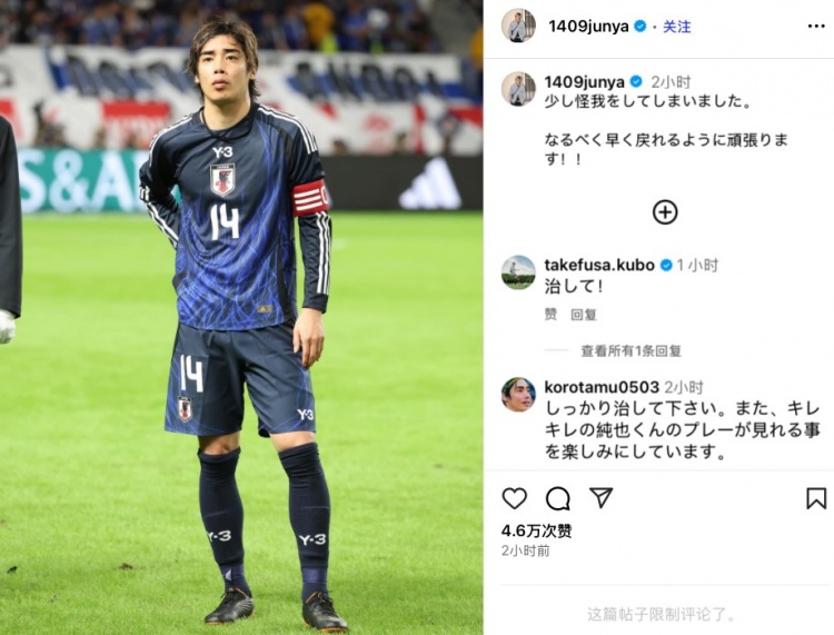 南野拓實(shí)、久保建英為這條社媒點(diǎn)贊,久保建英還送上祝福:“盡快康復(fù)!”