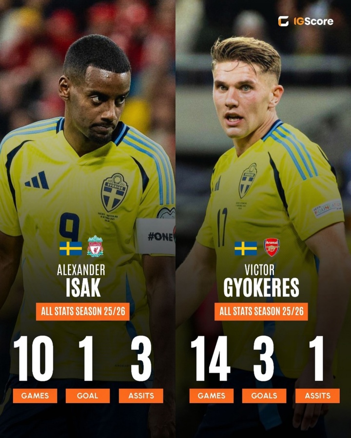 本賽季約克雷斯代表阿森納和瑞典國(guó)家隊(duì)出戰(zhàn)14場(chǎng)比賽,貢獻(xiàn)3粒進(jìn)球和1次助攻,目前他的德轉(zhuǎn)身價(jià)為7500萬歐元;伊薩克則代表利物浦和瑞典出戰(zhàn)10場(chǎng)比賽,貢獻(xiàn)1粒進(jìn)球和3次助攻,德轉(zhuǎn)身價(jià)1.2億歐元。